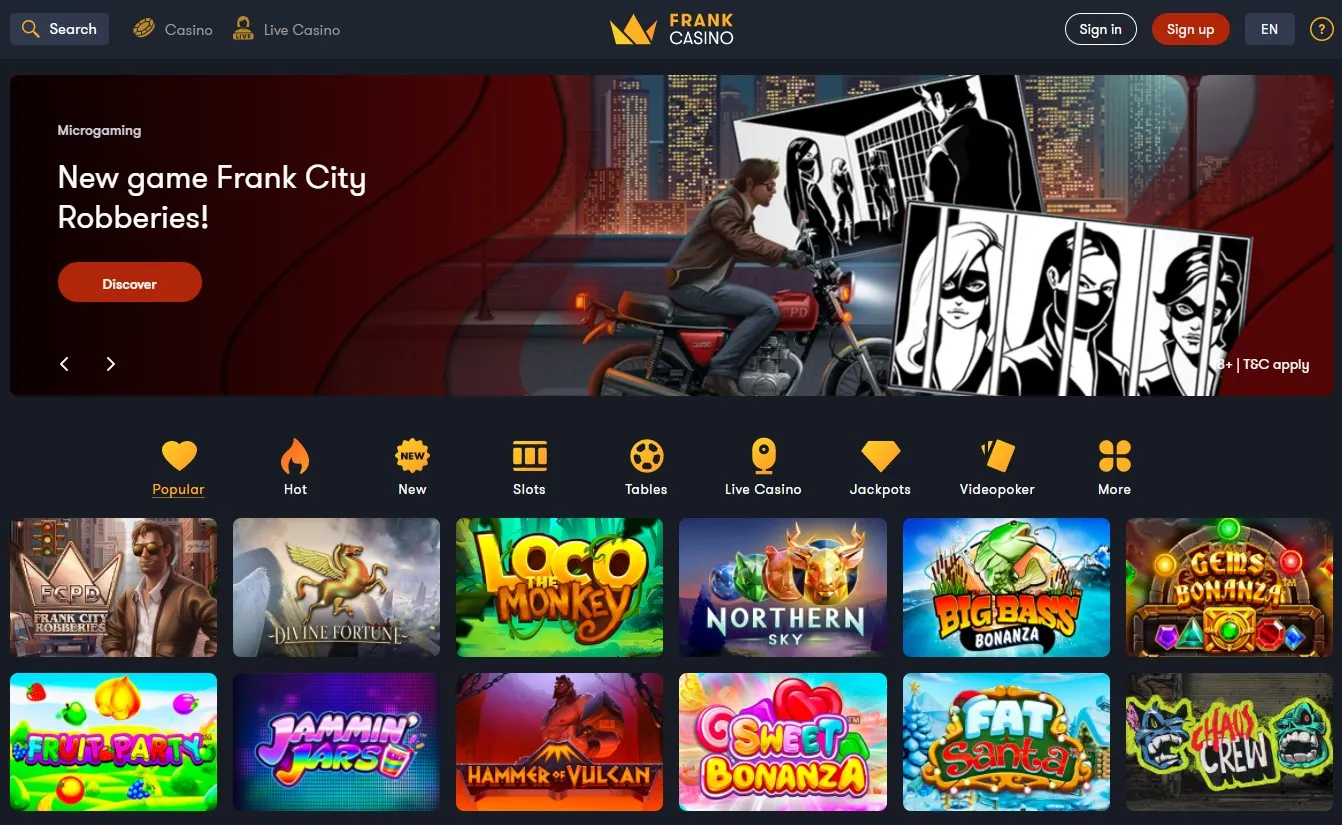 Frank Casino riktar sig till spelare som älskar att spela. Här kan du njuta av färgglada spelautomater, jackpatspel, live casinochatt och mer! Här hittar du bara de bästa spelautomaterna från kända leverantörer. Frank har också en bekväm frank casino supportchatt på webbplatsen, vilket visar att frank & fred casino verkligen värdesätter sina spelare!